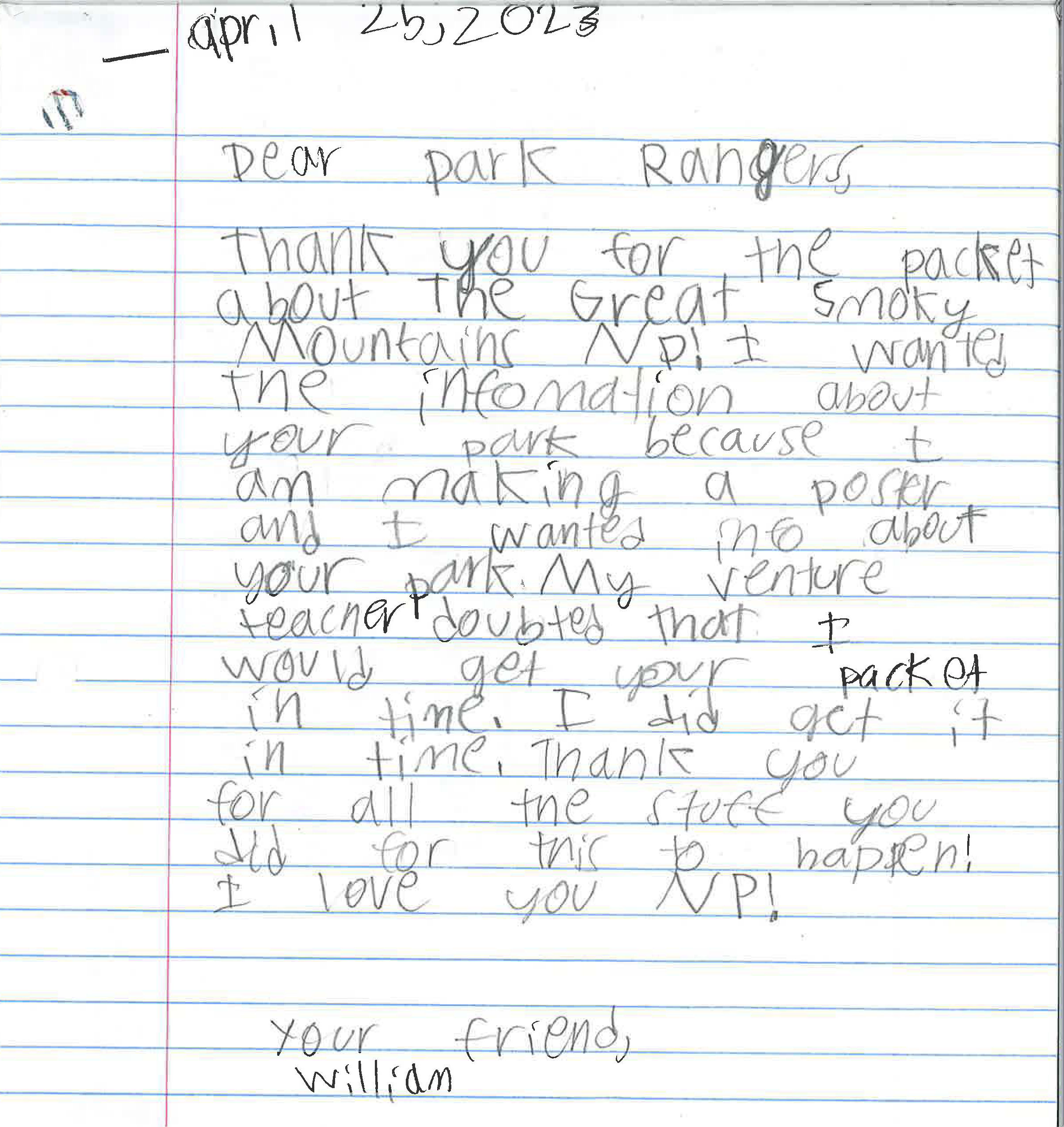 “What animals do you see most often in Great Smoky Mountain?” Milo wrote. “And how big is Great Smoky Mountain have smoke in it? Also is it a grassy or a snowy place? Have you guys ever been there because if you did do the animals like the place? Thank you, for reading my letter.”