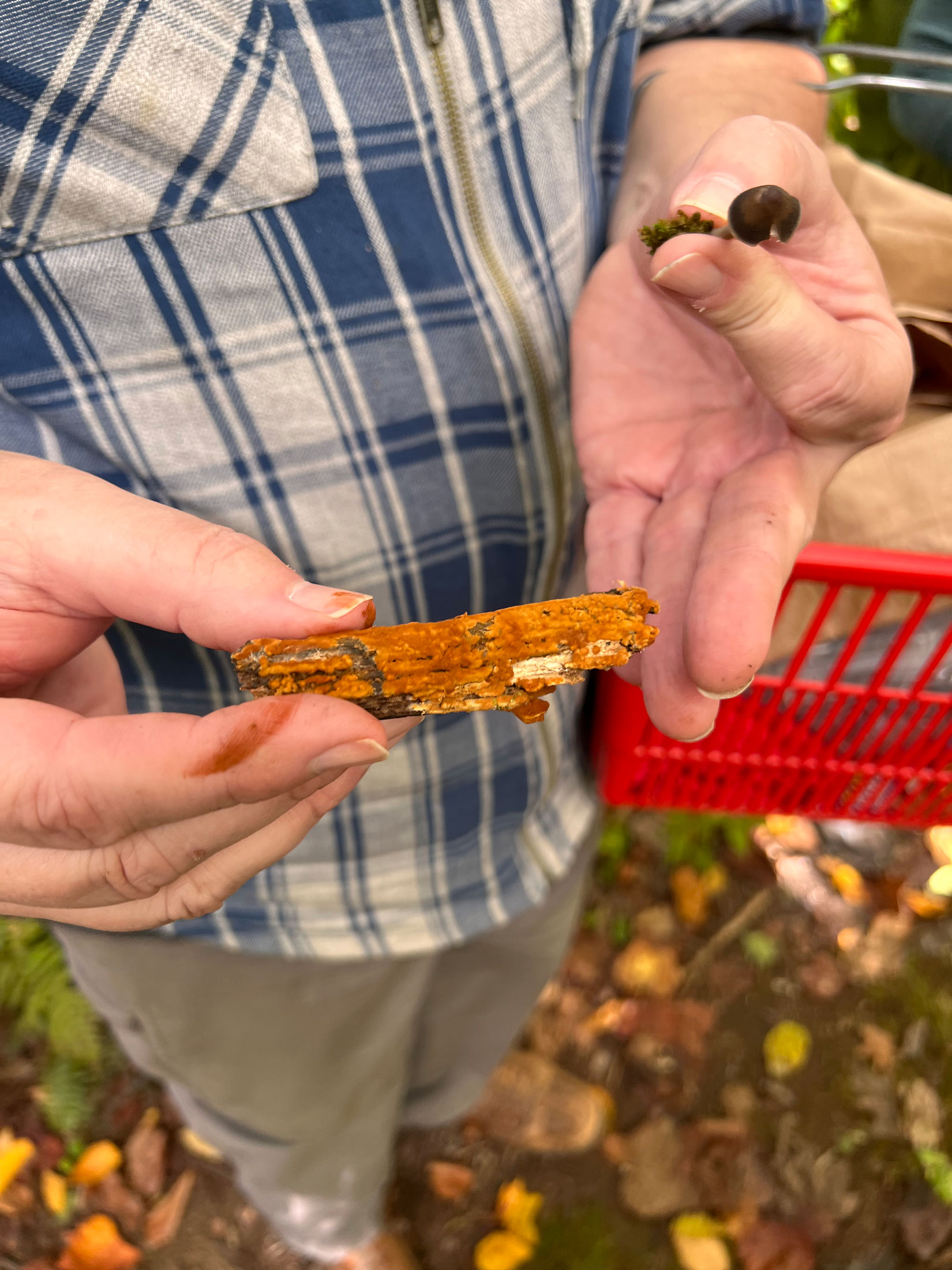Recent rains had created ideal conditions for mushroom growth, causing an abundance of colorful fruiting bodies of all shapes and sizes to poke out of the leaf litter and emerge from trees and rotting logs. Watching the group excitedly scatter along the trail, scouring the ground for mushrooms, was reminiscent of watching children searching for little treasures at an Easter egg hunt. “Ooohs” and “ahhhs” could be heard echoing through the woods, each discovery met with excitement.