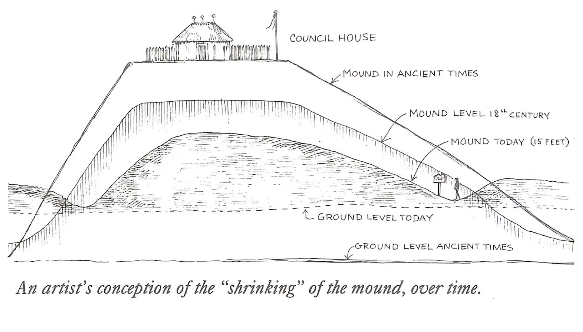 In Cherokee society, mounds were the heartbeat of the community. They were always built on level, riverside bottomlands to allow for dances, ball games, and going to water ceremonies, ethnographer James Mooney wrote in Myths of the Cherokee. According to Mooney, the community’s women piled the earth used to form them one basketful at a time, and the bodies of revered leaders and sacred objects were often buried within the structure. But the first step in creating a mound was to build a fire. A hollow cedar trunk would be inserted around the blaze to protect it as the dirt was piled higher and higher, extending all the way up to a structure known as a townhouse that would later be built atop the mound.
