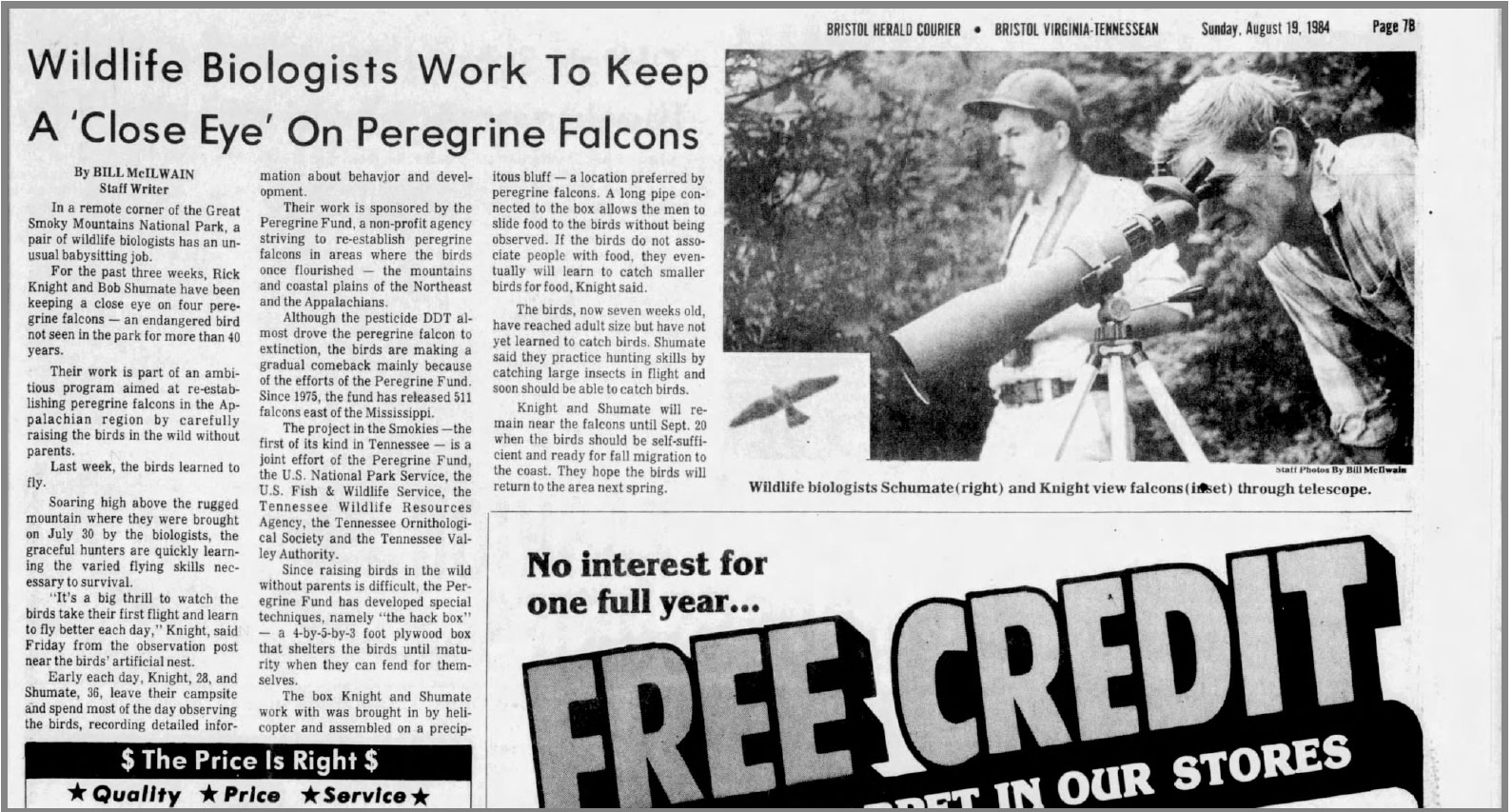 “The overall plan was to saturate the region of Southern Appalachia with young falcons and hope they would return to the general area when they grew up to start nesting,” Knight said.