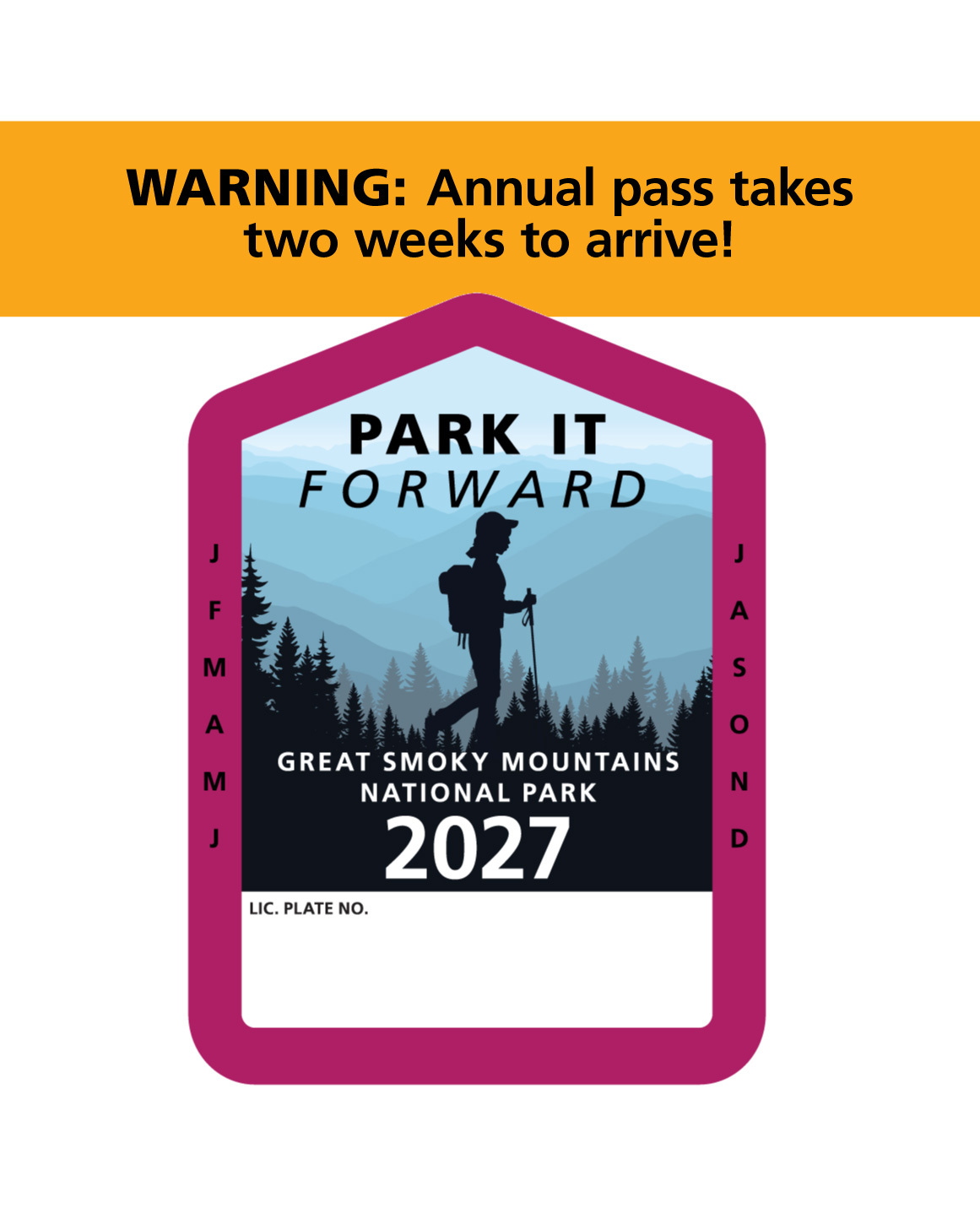 The official Great Smoky Mountains National Park annual parking tag is available for online purchase all year. Annual parking tags are valid for 12 months from the date of purchase and expire at 11:59 PM on the last day of the expiration month. The year indicates when the tag will expire. Each tag is valid for a single vehicle and must include a license plate number matching the vehicle in which it is displayed. Parking tags are not replaceable, refundable, or transferable. The tag will be shipped via USPS and instructions are included on how to add your vehicle license plate number to the tag. Daily and weekly parking tags are available to purchase at visitor centers only. One hundred percent of revenue from the Park it Forward program stays in the park and provides funding for improved visitor services like trail maintenance, custodial services, trash removal, and law enforcement staff.