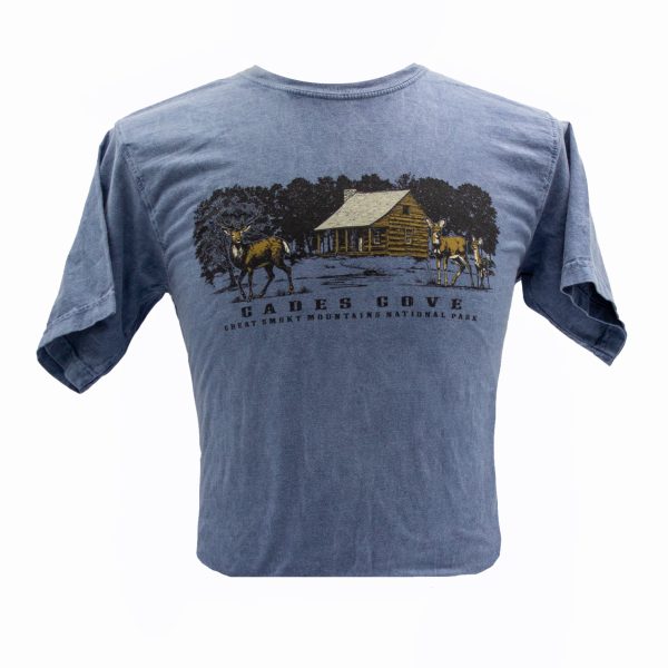 Whether you drive, bike, or even enjoy walking the Cades Cove loop road in Great Smoky Mountains National Park, you’ll feel great wearing this shirt. It features a historic cabin with a family of deer and is made of 100% ring spun cotton.