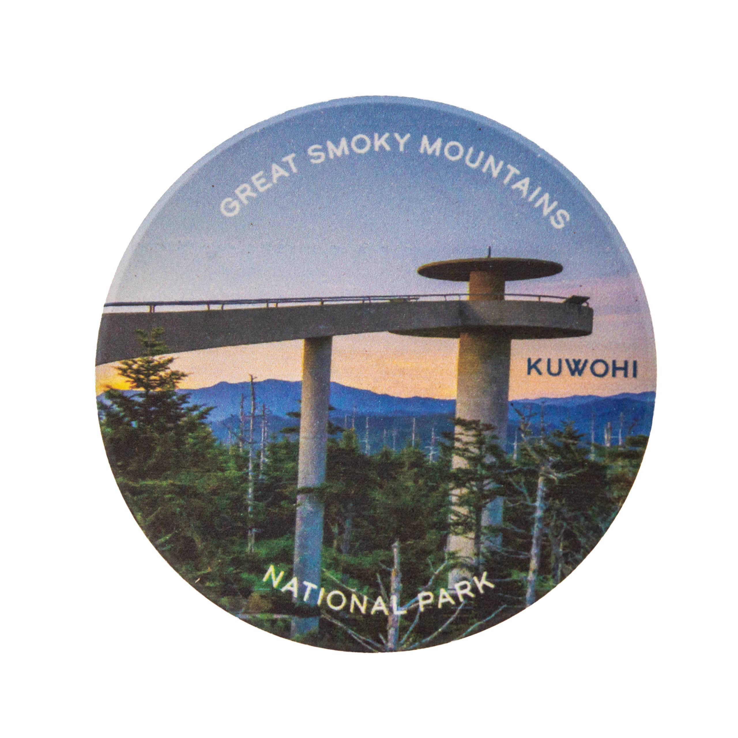 Protect your car from unwanted spills with absorbent car coasters featuring Kuwohi observation tower – a favorite site from Great Smoky Mountains National Park. The coasters are made from special absorbent ceramic stone that easily absorbs water outside the cup.