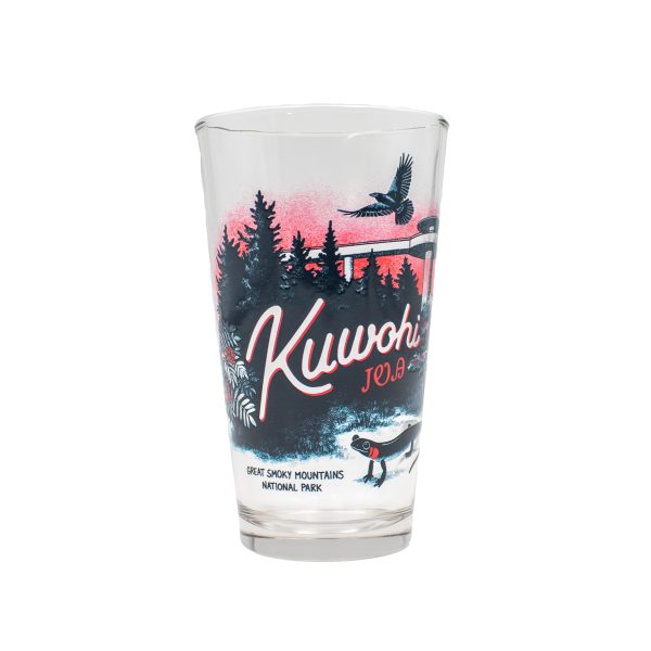 Raise a toast to the highest point in Great Smoky Mountains National Park with the Kuwohi pint glass featuring the observation tower! This glass holds 16 ounces and hand wash only is recommended.