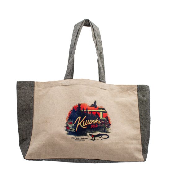 This stylish Kuwohi tote bag will be one to carry around with you everywhere you go! It features Great Smoky Mountains National Park, the Kuwohi observation tower, and a red-cheeked salamander. This tote is made out of recycled cotton and measures 16 x 11 x 6 inches. Also makes a great alternative to plastic bags.