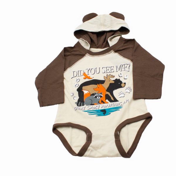 Little ones will look adorable in this Great Smoky Mountains National Park hooded long-sleeved onesie. Featuring forest friends and their tracks on the front, little ears on the hood, and three snaps on the bottom for easy opening and closing. Made of 100% Cotton.