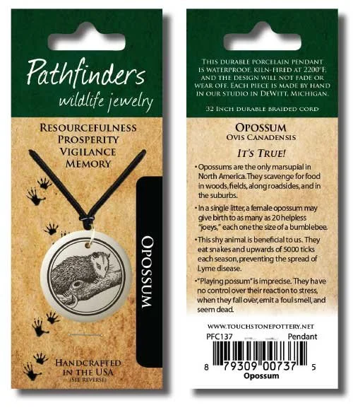 Pathfinders wildlife pendant collection features durable porcelain pendants that are waterproof and kiln-fired at 2200 degrees so the design will not fade or wear off. The opossum pendant is made by hand in Pathfinders’ studio in DeWitt, Michigan and includes a 32-inch cord.