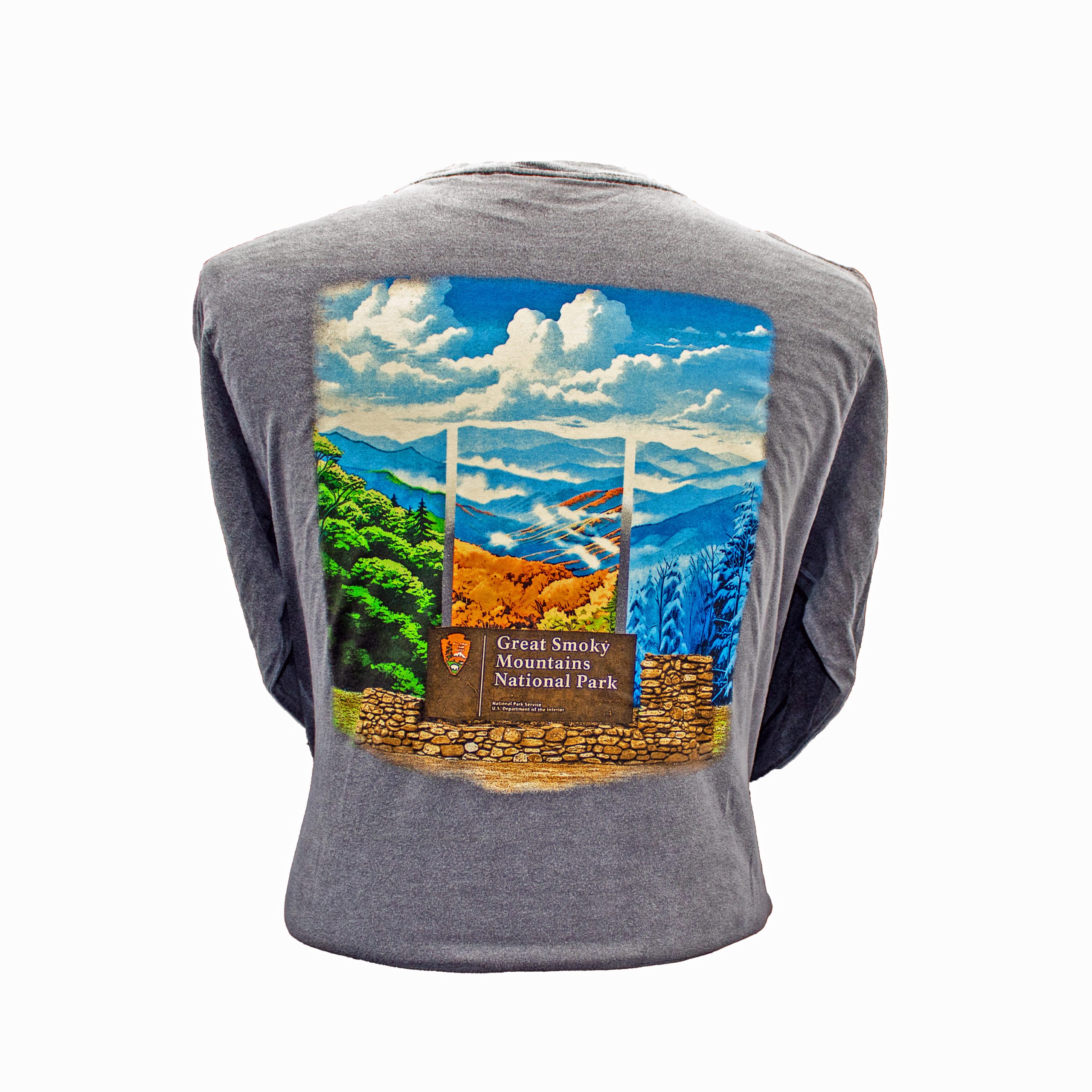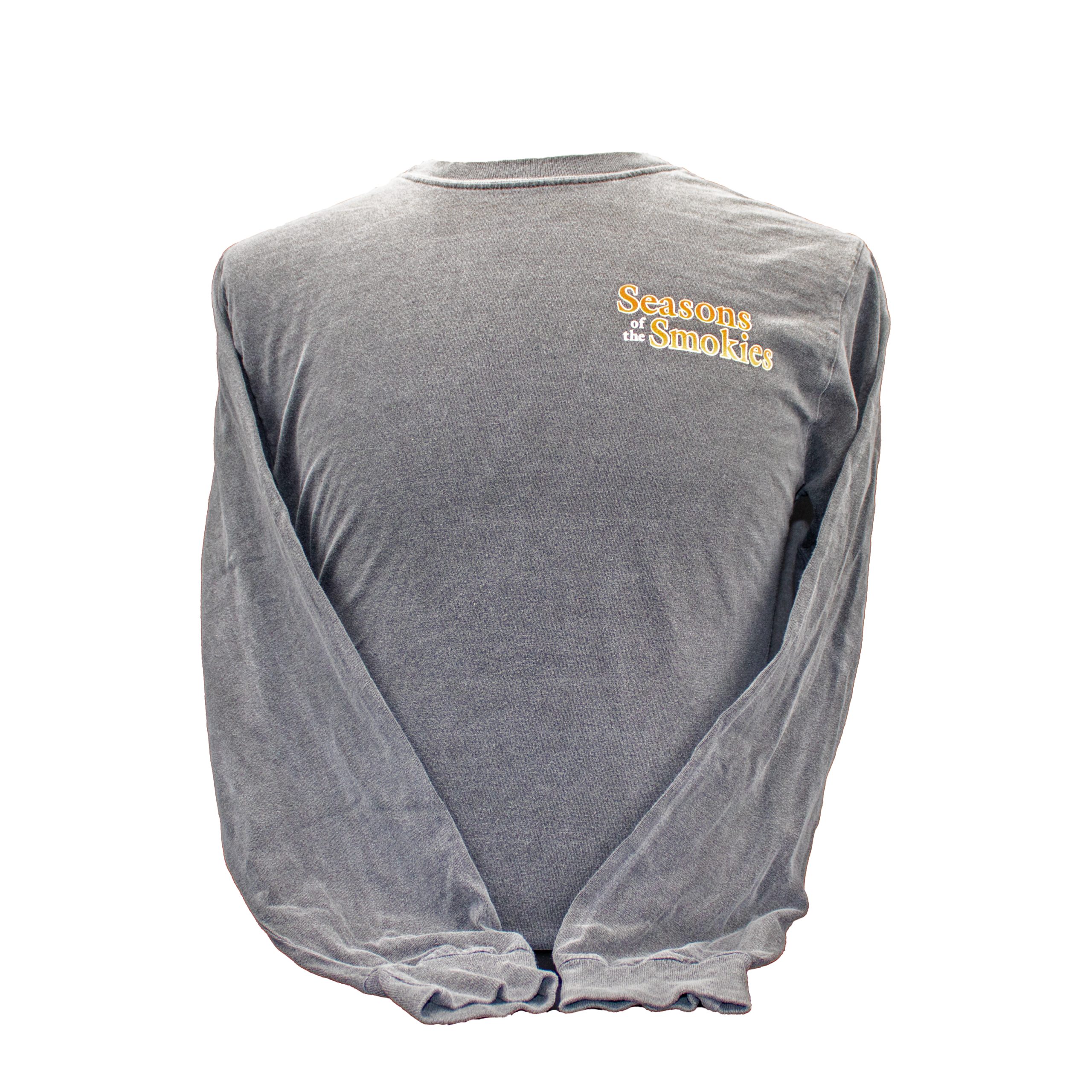 Stay warm in cooler temps with this long-sleeved souvenir t-shirt that features Seasons of the Smokies in Great Smoky Mountains National Park! With large artwork on the back of the national park sign surrounded by colorful scenes of the seasons throughout the year, and small artwork on the left chest saying “Seasons of the Smokies” on the front. Shirt is made of 100% Cotton.