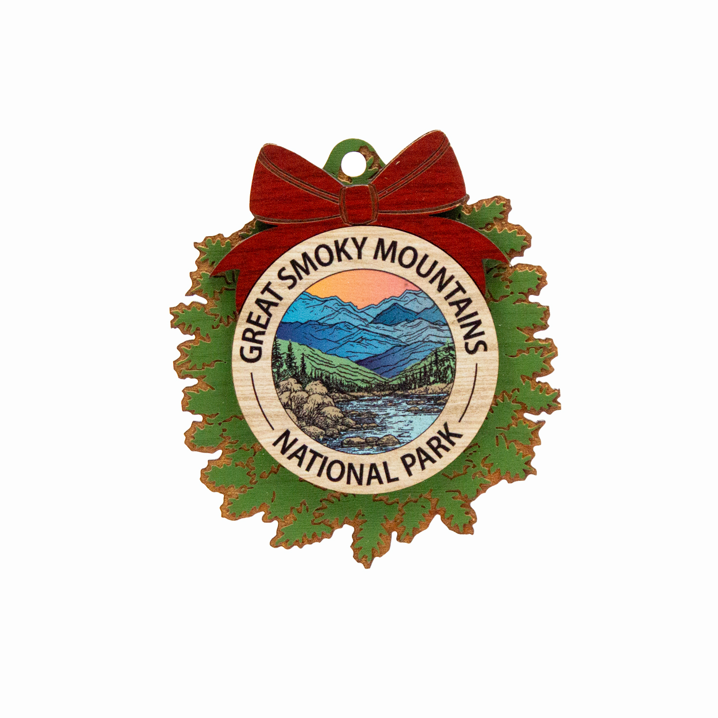 A great addition for your holiday decor collection! This wreath ornament that features Great Smoky Mountains National Park with a picturesque scene in the middle and a red bow on top. It measures 3.75 X 3 inches and includes a wooden tag with the current year.